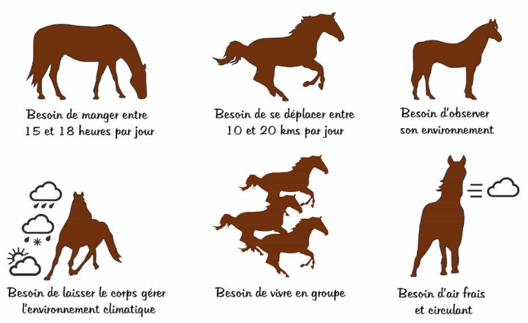 A l’état naturel, le cheval est un animal grégaire qui vit en troupeau ce qui lui assure sécurité et interactions sociales. Il occupe un environnement dans lequel il effectue des déplacements constants pour trouver toutes les ressources dont il a besoin pour survivre : de l’eau, des abris, de la nourriture : il passe la plus grande partie de son temps à se nourrir.